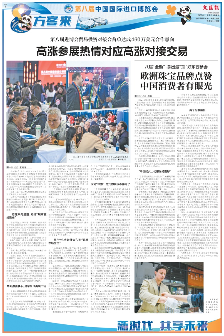 第八届中国国际进口博览会贸易投资对接会上,展商客商热烈交流。 本版照片均本报记者 邢千里 摄 ■本报记者 王宛艺 郑重握手、签约,昨天下午1点半,第八届中国国际进口博览会贸易投资对接会刚开幕,一桩价值460万美元的意向合作就迅速达成。合作的双方,一厢是首次参展的全球材料科学巨头——美国戈尔公司;另一厢,是上海两家深耕细分领域的专精特新“小巨人”企业——上海六晶科技股份有限公司与上海诺诚电气股份有限公司。 这不只是一笔订单,更像是进博会促进全球贸易增长的生动缩影。 记者从中国国际进口博览会城市服务保障领导小组办公室获悉,截至昨天傍晚6点,第八届进博会当日累计入场23.75万人次,单日客流创历史新高,展会运行总体平稳有序。而与高涨的参展热情相对应的是高涨的交易意愿与行动。 搭建双向通道,助推“展商变投资商” 在进博会上,从相遇,到相融。在贸易投资对接会现场见证签约过程的市经济和信息化委相关负责人说,在中国经济迈向高质量发展的浪潮中,本土创新力量与全球先进技术,通过进博会平台的助推,在同台竞技与深度合作中迸发出巨大能量与无限可能。 “我们民营企业本身,从昔日‘跟跑’到今日‘并跑’,并在一些领域实现‘领跑’,这是我们出海的底气。”上海诺诚电气股份有限公司董事长茆顺明的话语,透出中国创新力量的信心。 当天,像这样促成中外企业“双向奔赴”的洽谈桌,现场共有50张。 记者了解到,本次贸易投资对接会期间,中国银行上海市分行与上海市中小企业发展服务中心紧密合作,共同为上海企业与海外展商搭建起贸易与投资的双向通道。比如:在贸易洽谈方面,双方共同组织近20家专精特新中小企业,与来自印度尼西亚、马来西亚等国的境外展商开展“一对一”“面对面”的精准对接,推动采购合作落地;在投资促进方面,与市、区两级投促部门联动,在现场举办数十场“投资上海”系列招商推介活动,展示上海一流的营商环境,积极助推“展商变投资商”。 中外强强联手,进军全球高端市场 上海六晶科技股份有限公司总经理桂海燕对戈尔公司这个名字并不陌生。在她记忆中,这家企业的材料技术“在上世纪便已耳熟能详”。 这家企业开发的薄膜材料,有“世纪之布”之称,曾被美国《财富》杂志称为“世界百佳美国产品”之一。防水、防风、透气,一举突破传统防水面料无法兼顾透气的技术瓶颈。这次他们带来的却是医疗板块的创新成果,包括覆膜支架等高端产品。戈尔公司全球商务总裁麦克·凯恩克这样理解,企业早前就进入过中国市场。眼下的中国,有持续升级的产业需求、蓬勃发展的生物医药市场,以及社会对高品质医疗解决方案的迫切期待。对成立已逾60年的戈尔公司而言,此番首次踏入进博会场馆,其意义远不止于一次寻常参展,更是一次面向中国这一重要市场的亮相和融入。 “我们将以此次进博会为契机,把我们在生物医药领域的最新研发成果引入中国,造福更多患者。”麦克·凯恩克感叹小企业的大能量。 “一家中小型民营企业,有80余项专利。”连现场来签约的戈尔亚太区业务负责人林伟仁都惊叹。上海六晶科技在影像类零部件领域深耕不辍,成为西门子、飞利浦等全球医疗影像巨头的供应商。 他们此次与戈尔公司的合作,将聚焦于医疗防护面料的创新。六晶科技看中了戈尔公司独特的面料基材,旨在将自己拥有知识产权的、在柔软性上全球领先的特殊材料配方与之结合,共同开发新一代易于擦拭、抗血渍、排汗舒适的医疗防护服。 桂海燕的目标明确——“强强联手”,进军全球高端市场。这种基于自主知识产权、瞄准价值链顶端的合作,清晰标示出中国中小企业的“含金量”已今非昔比。 从“什么火做什么”,到“填补市场空白” “从前是跟着别人做产品,什么火做什么。现在会去观察市场缺什么,我们去填补空白。”茆顺明说,这是他们如今想要拓展海外市场的底气。上海诺诚电气股份有限公司和上海六晶科技,它们的成长轨迹,是中国制造业从量变到质变,从代工模仿到自主创新的剪影。 诺诚即将三十而立,发展历程恰与中国经济转型期同步。他们敏锐捕捉到外科手术中神经保护这一全球性的临床难题,如甲状腺手术可能导致患者失声,脑部或脊柱手术可能造成瘫痪或功能丧失,其根源往往在于术中神经的不可逆损伤。 瞄准这一空白,诺诚电气开启了十余年的攻坚。2011年立项,2022年拿到神经外科、骨科术中神经电生理监测注册证,他们研发的术中神经刺激监测仪,建立起属于自己的技术壁垒。这款产品能实时监测手术中的神经信号,一旦神经面临损伤风险便会及时预警,如同为外科医生装上“第三只眼”。 “近年来,我们意识到要做国际贸易。”全球范围内,目前能做到这一点的仅4家企业,而诺诚电气是国内唯一一家,并已在五六个国家完成本地化注册,预计今年年底就能获得欧盟CE认证。 他们没有止步于产品成型,而是持续迭代,致力于降低使用门槛,让复杂的医疗设备变得“人人会用”,甚至探索用机器人辅助监测,解放人力。 “我们的创新成果,可以借助与戈尔公司合作的契机走向世界,与全球顶尖企业同台竞争。”茆顺明说。 现场“红娘”:宽泛的英语不够用了 “我们需要翻译!”对接会现场,桌长黄伟莉英语不错,但也明显感到自己宽泛的英语