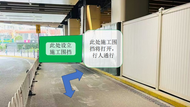 从南公交枢纽至地铁站(双向),施工方将打开一处原有围挡(在增设的施工围挡旁边),用于行人通行。