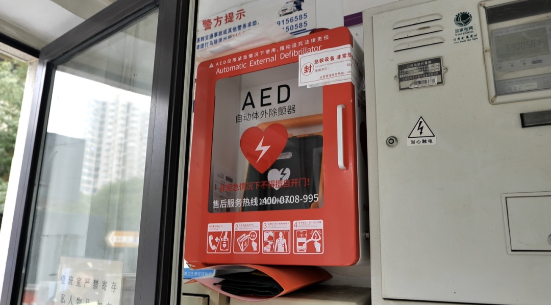 11月6日上午,记者在嘉宝梦之缘景庭小区看到,两个门卫室均安装有AED设备,箱体上“紧急救生设备”标识格外醒目。