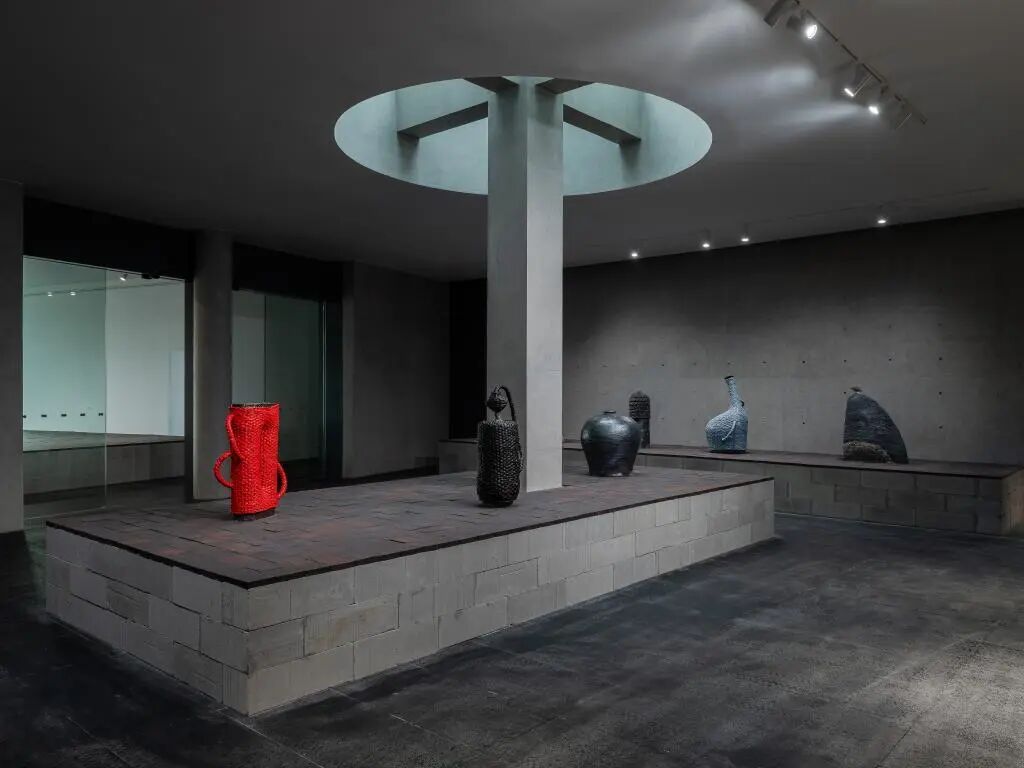 步入展厅,首先映入眼帘的便是艺术家西斯特·盖茨的作品。他以嘉源海美术馆阅览室的藏书为媒介,与安藤忠雄设计的光之门厅遥相呼应,举办了一场专为空间量身定制的仪式。他带来了极具代表性的“非洲民艺”陶瓷系列,在创作过程中,他不断重新诠释“手工”的意义——这不仅仅是一门技艺,更是信仰的传承与延续。