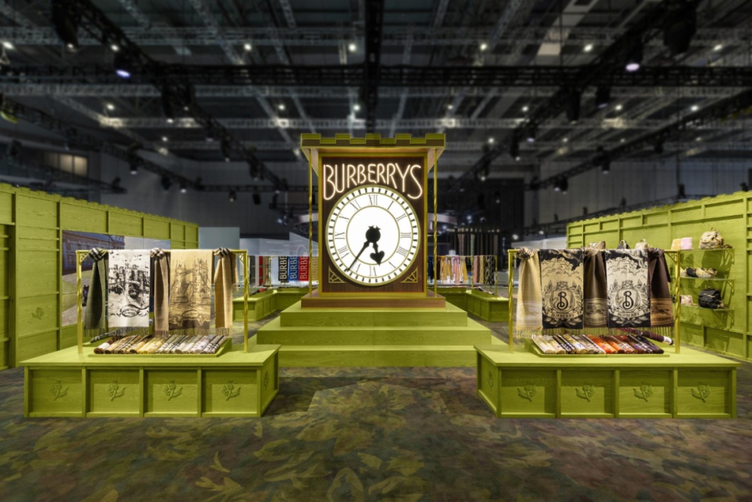 展台正中心是“博柏利时钟”装置,其设计灵感源自超大尺寸的车站时钟以及博柏利曾悬挂于伦敦Haymarket旗舰店外墙的标志性时钟。