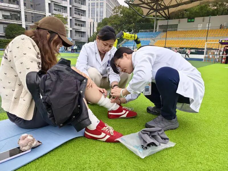 活动当天,两位赛前受伤的跑者先后抵达医院摊位寻求帮助。其中一位跑者由康复治疗师通过专业肌内效贴布紧急处理,以精准贴扎为受伤部位提供支撑、缓解疼痛,助力其以相对良好状态应对赛事;另一位女性跑者则经针灸推拿科张主任详细了解伤情后,接受了现场针灸治疗以疏通经络、缓解不适。令人欣喜的是,这位女跑者凭借坚韧毅力与调理后的良好状态,在后续比赛中斩获冠军佳绩。赛后,她特意重返医院摊位表达诚挚感谢:“赛前受伤本来没抱太大希望,没想到针灸后疼痛缓解特别明显,才能顺利完成比赛拿到名次!” 随后她还体验了其他康复项目,治疗师再次运用专业肌内效贴布手法为其处理轻微不适,助力加速恢复。