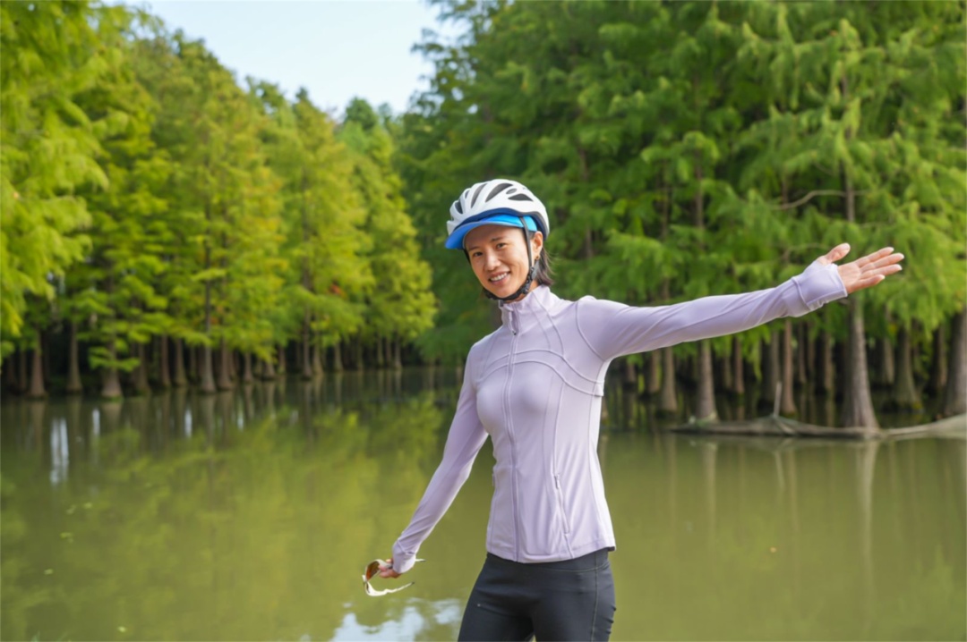在青西灵镜打卡点,徐莉佳与骑友们共同完成特色pose挑战,并分享骑行运动的乐趣:“骑行对我们的关节特别友好,相比跑步来说,在骑行的过程中能看见更多的风景,持续的运动时间也更长,这也是我在运动队时期以及在退役后依旧在坚持的一项运动。”她的参与不仅提升了活动影响力,更让“沪派江南”的内涵从静态的文化保护,延伸至动态的体育精神和健康生活方式的传播,更将骑行活动与即将开幕的中国国际帆板大师赛紧密相连,形成“体育+文旅”的双向联动,为青浦秋日注入蓬勃的运动活力。