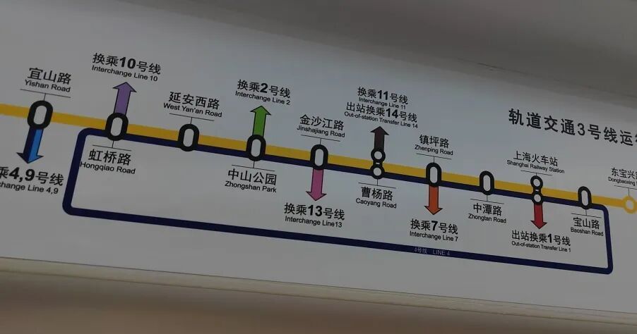 原来,地铁3、4号线在宜山路站至宝山路站之间,共有9座共线车站,部分列车为两线共享,并采用黄色和紫色的线路标识色带,但这同时也带来了辨识上的困扰。