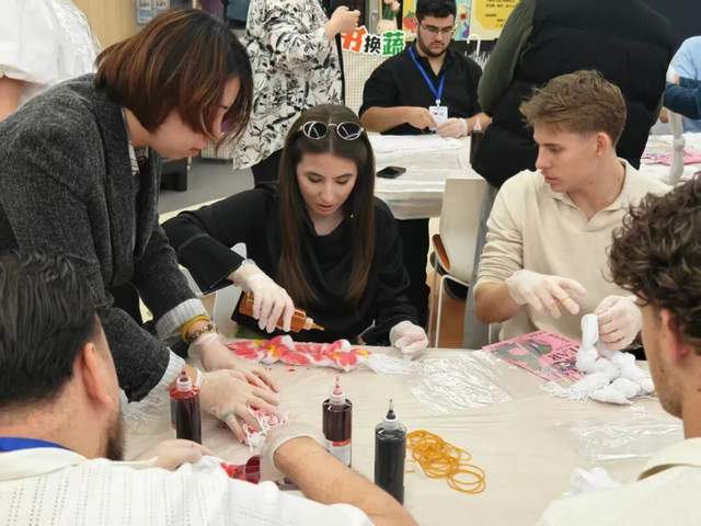 在专业指导老师与翻译的协助下,学子们领取布料、染料、工具等材料,参与了一场非遗扎染手工体验。老师详细讲解扎染的历史渊源、基本技法,从捆扎的力度把控到染色的步骤要领,还现场演示了图案设计的巧思。当一幅幅色彩交织、纹样各异的作品完成时,现场充满欢声笑语。这份可带走的“手作记忆”,不仅让大家亲身体验了传统工艺的魅力,也成为文化交流的温暖纽带。