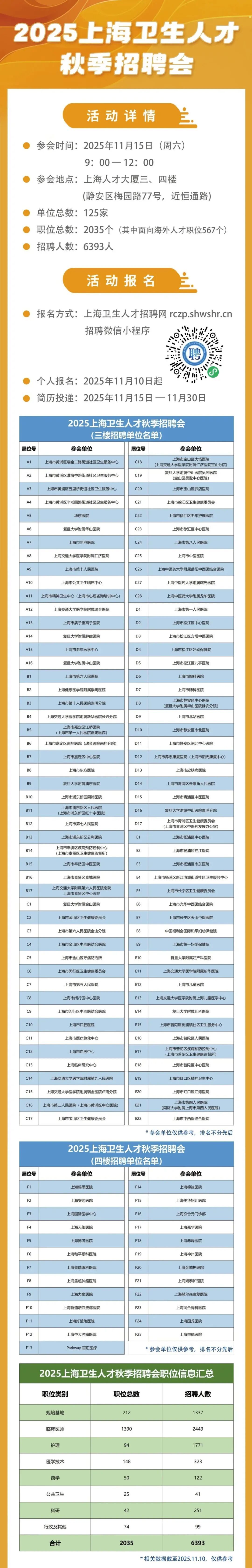 为积极推进本市卫生健康人才队伍建设,2025上海卫生人才秋季招聘会将于11月15日(周六)9:00—12:00在上海人才大厦(梅园路77号)三、四楼举办。