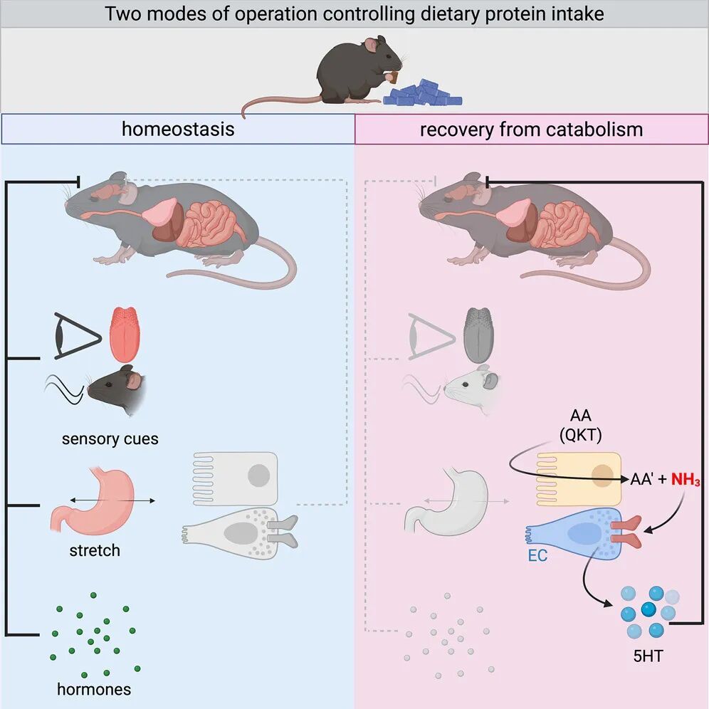 研究团队通过构建小鼠禁食24小时后恢复进食的模型,观察到令人震惊的现象:在经历了能量耗竭(模拟分解代谢状态)后,尽管小鼠总体能量需求增加,但它们却主动避免摄入高蛋白食物,转而选择高碳水或高脂肪饮食。这种对蛋白质的厌恶是暂时的,且具有高度的选择性。
