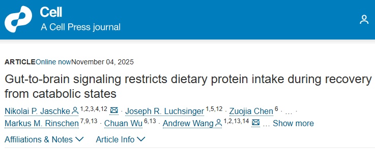 近日,耶鲁大学医学院Andrew Wang团队在国际顶级期刊《细胞》发表的一项研究首次揭示了答案:肠道正在通过一条神秘的神经通路,向大脑发出“少吃点蛋白质”的指令,主动限制了食欲。
