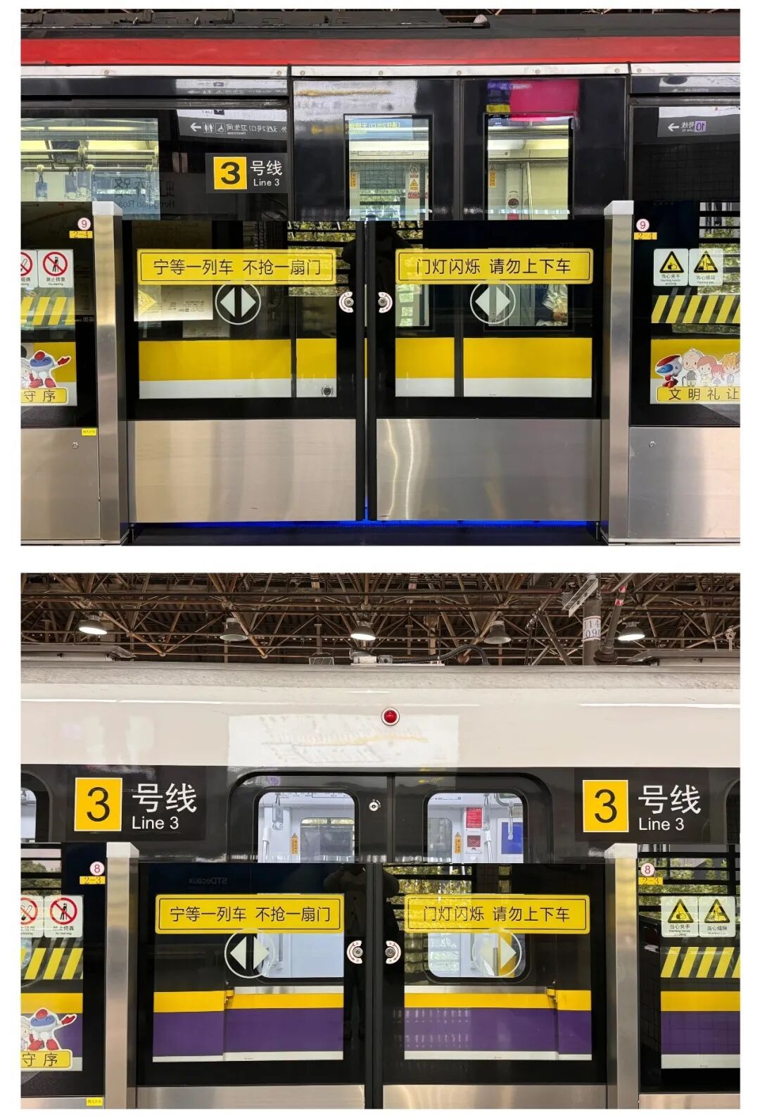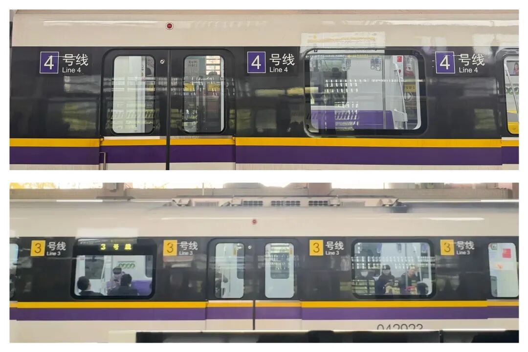 为何3、4号线的标识长期困扰乘客?根源在于两线在宜山路至宝山路区段实行共线运营。部分列车在两线之间共享运行,车身统一涂装为贯穿整节车厢的色带:一条宽约20厘米的紫色条纹,上方紧邻一条宽约5厘米的黄色条纹。