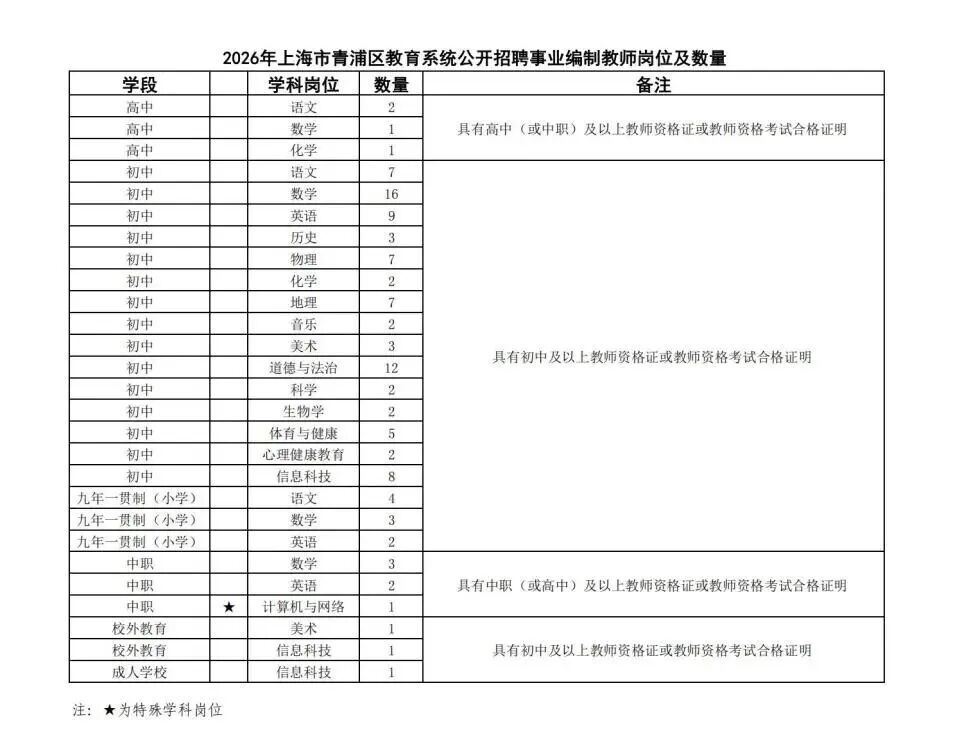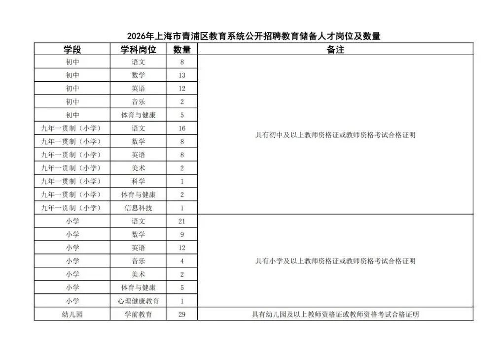 详见附件2“2026年上海市青浦区教育系统公开招聘事业编制教师岗位及数量”、附件3“2026年上海市青浦区教育系统公开招聘教育储备人才岗位及数量”。