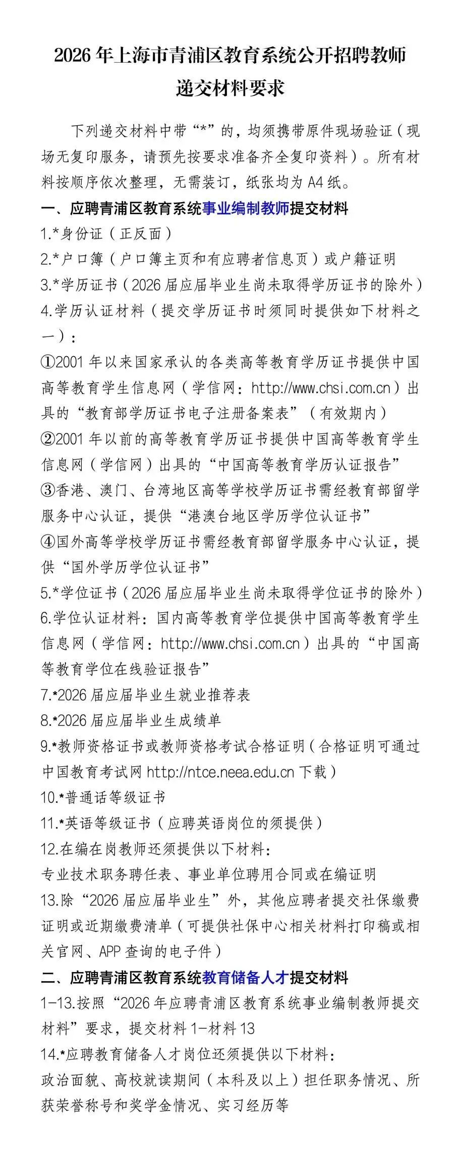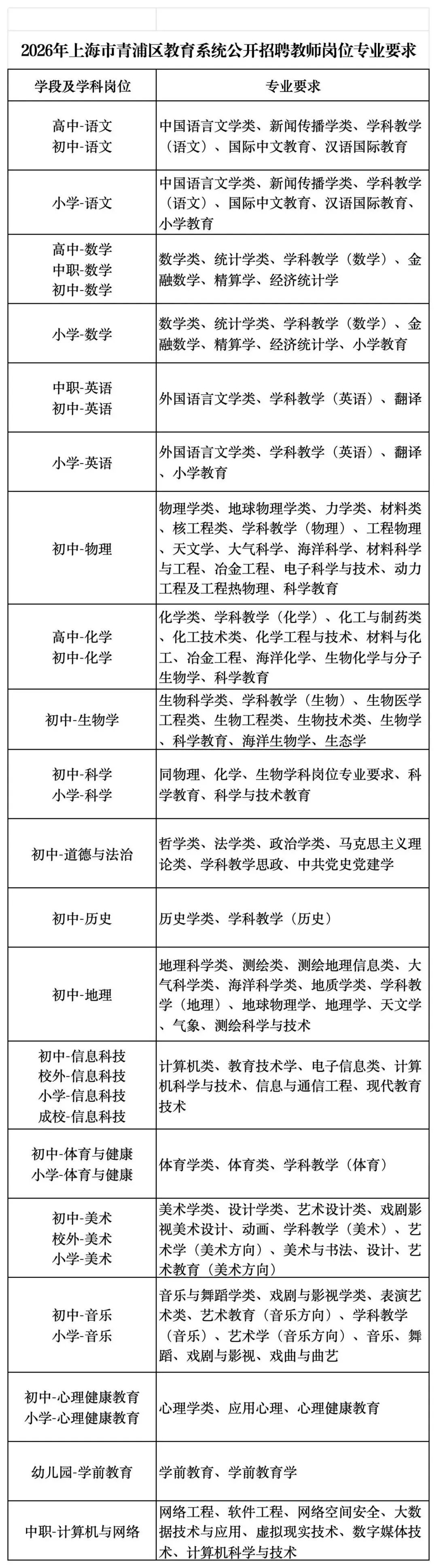 所学专业应与应聘学科一致或相关(详见附件1“2026年上海市青浦区教育系统公开招聘教师岗位专业要求”)。