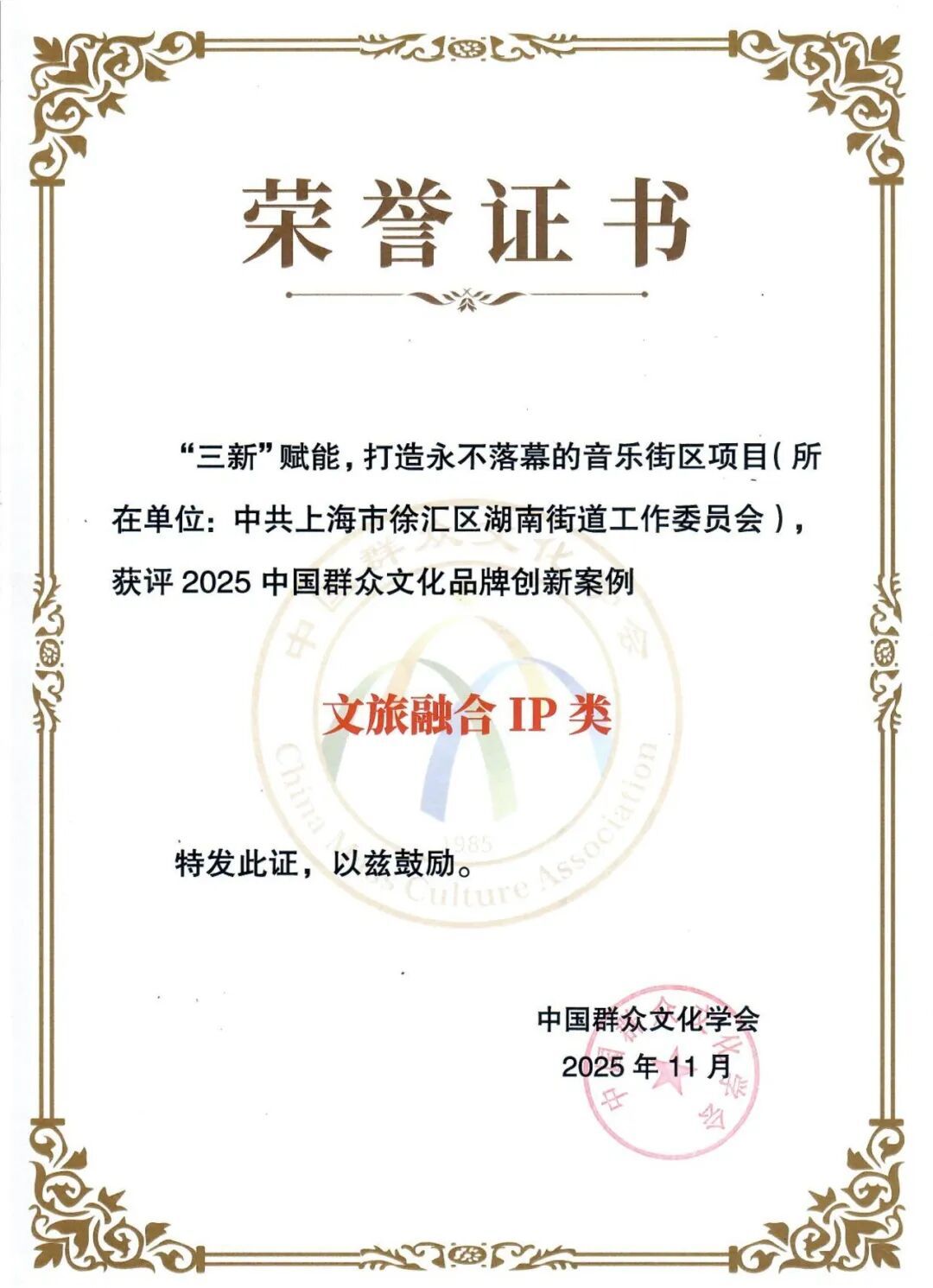近日,中共上海市徐汇区湖南街道工作委员会申报的“‘三新’赋能,打造永不落幕的音乐街区”案例,成功获评2025中国群众文化品牌创新案例“文旅融合IP类”奖项,成为上海基层文旅融合与群众文化建设的标杆范例。