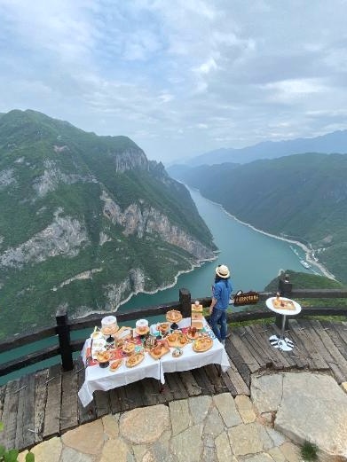 · 巫山神女天路:海拔1000米左右的悬崖峭壁之间,船方搭起天幕准备了香槟、饮料和茶点,远眺长江大拐弯,与神女峰隔江对望。