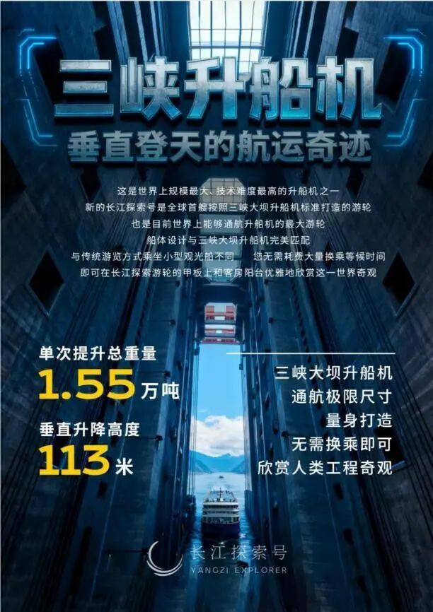 · 三峡升船机新长江探索号是目前第一艘按照三峡大坝升船机标准打造的游轮,也是目前能够通航升船机的大游轮,您可以在游轮甲板或客房阳台上直接欣赏这一奇观。