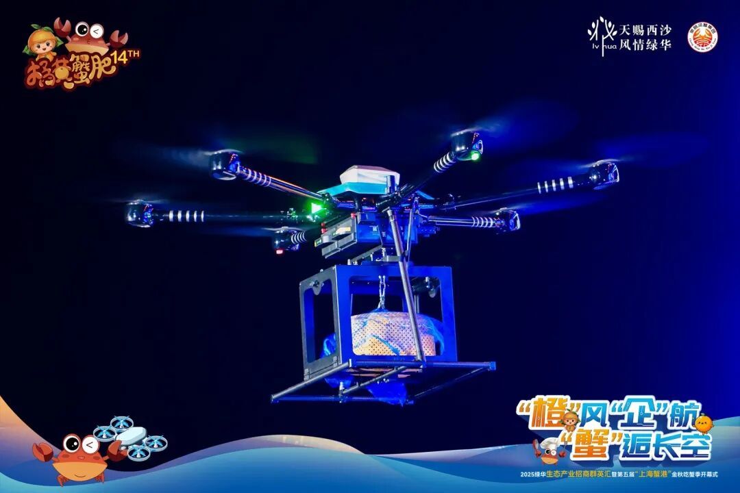随着沉甸甸的蟹笼缓缓起网,一只只膘肥体壮、张牙舞爪的崇明清水蟹浮出水面。随后,这些新出水、吐着泡泡的大闸蟹便被装进了名为“鲜航一号”的物流无人机。不一会儿,“鲜航一号”便满载着清水蟹出发,飞往了主会场。