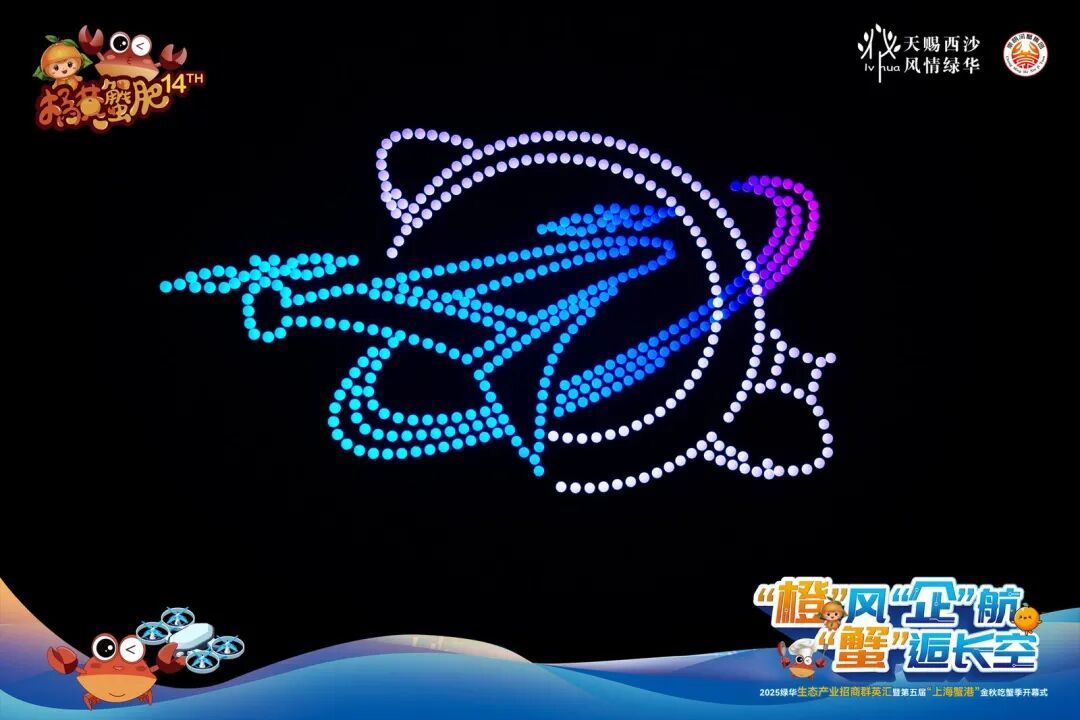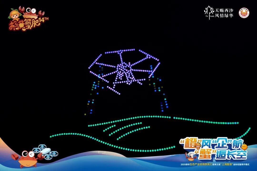 除舞台节目外,无人机科技展演环节成为本届开幕式的一大亮点。500架无人机在主会场上空,随着音乐在夜空中灵活变化,构成候鸟、绿华蜜橘、清水蟹等多幅动感十足的点阵图案,让人大饱眼福。