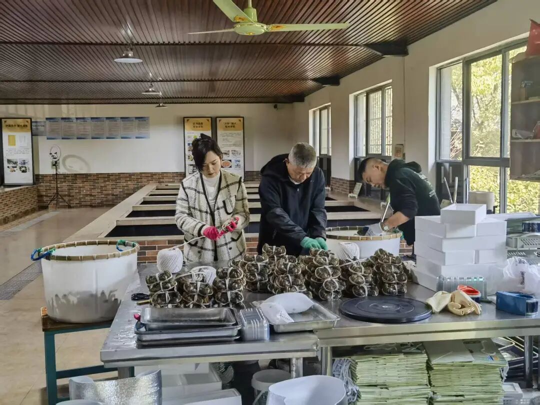 在分拣区,蟹农将不同规格的大闸蟹分别放至对应的蟹桶中,再统一进行激光打码。最后的包装环节,只见蟹农们先是用棉绳将大闸蟹绑好,然后装入保温袋并放进泡沫箱,紧接着在上面放置冰袋,最终用胶带封装后发货。