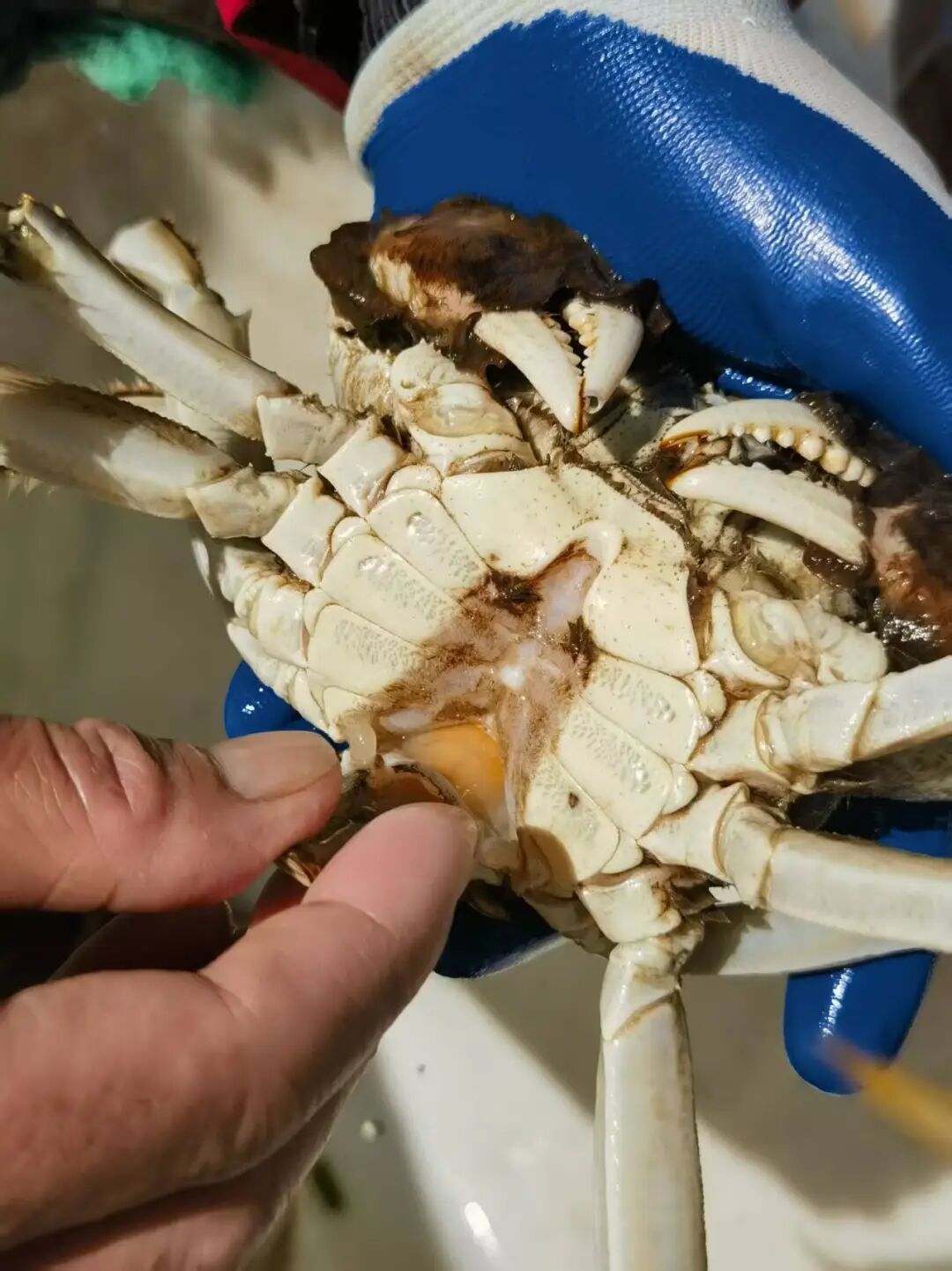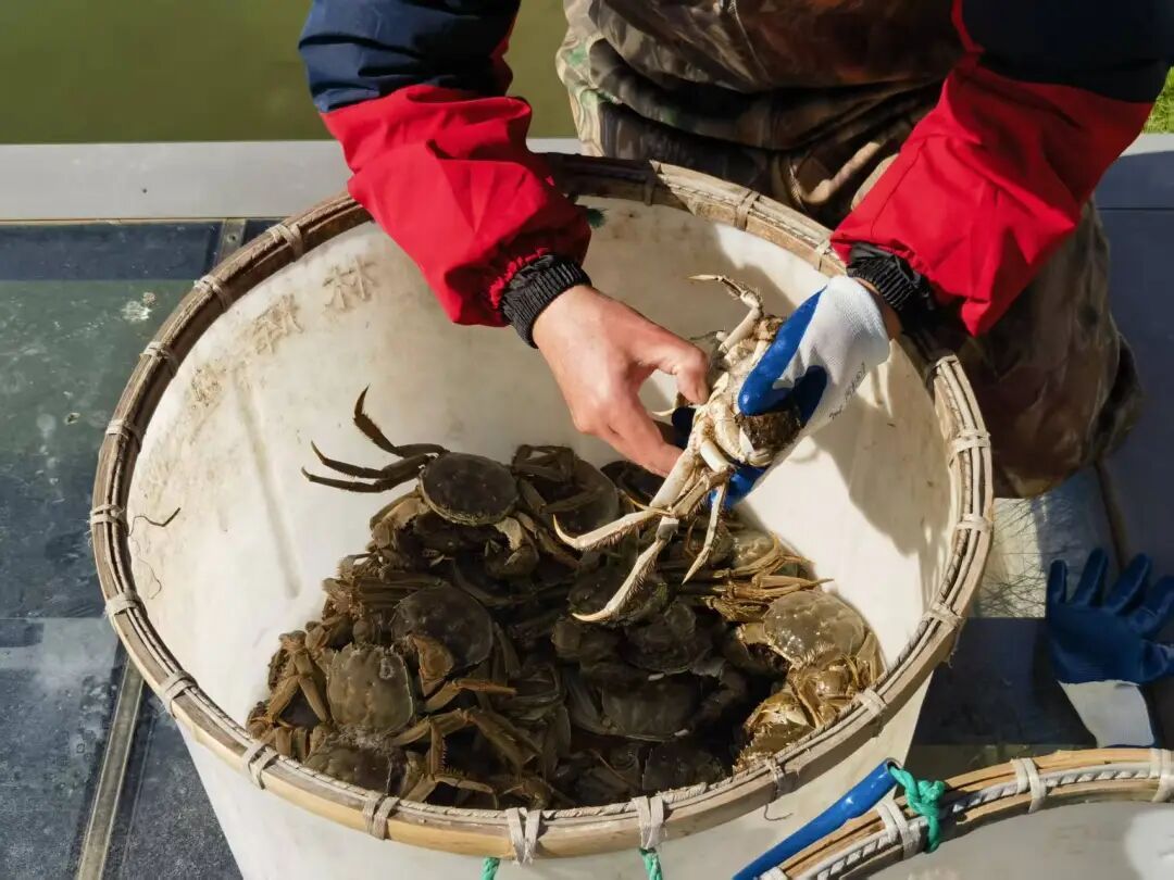 上午9时半,记者来到小昆山镇荡湾里蟹庄看到,蟹农将竹排划向蟹塘中的地笼放置点,用抄网打捞大闸蟹,随后上岸进行初筛,通过观察蟹身色泽、捏按蟹腿、掰开蟹脐等方式,筛选出符合上市标准的大闸蟹。“螃蟹具备青背、金爪等特征,且蟹壳隐约透出红色,说明已经成熟了,可以上市。”蟹农张师傅告诉记者。