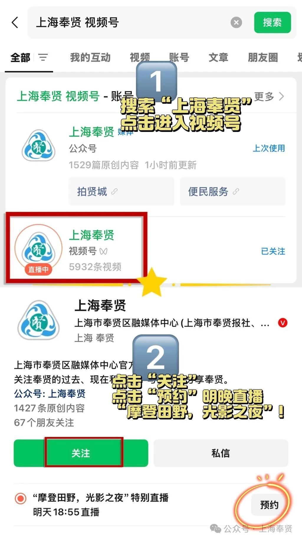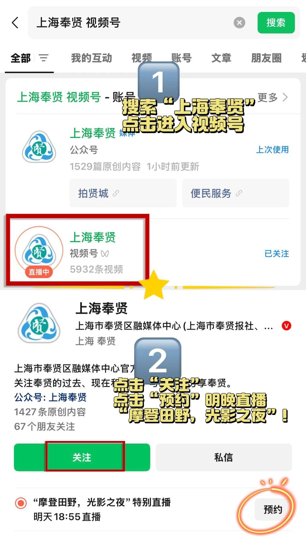 关注“上海奉贤”视频号,并预约明晚直播(预约方式见图2)