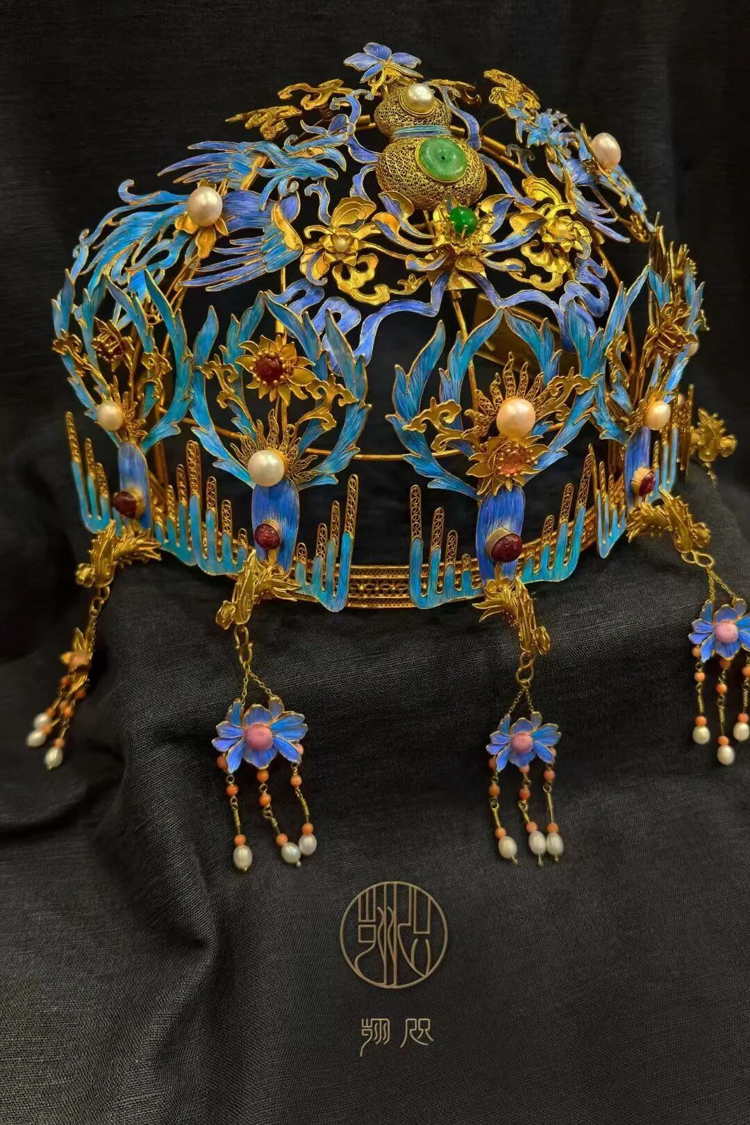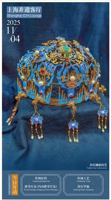 11月5日至10日,第八届中国国际进口博览会在国家会展中心(上海)举行。进博会举办期间,位于新闻中心内的“上海非遗客厅”华丽亮相,其中就有由金海街道成功申报的非遗项目——羽毛镶嵌技艺。 第八届进博会新闻中心“上海非遗客厅”全景 “羽毛镶嵌技艺”是中华传统工艺的瑰宝,是中国传统金属工艺和羽毛工艺的完美结合。常用金属制作底座,并以羽毛进行镶嵌(非保护非保育养殖类飞禽自然脱落的羽毛),可以起到点缀美化首饰和摆件的作用,作品光泽感好,色彩艳丽。 羽毛镶嵌技艺作品 金海街道“羽毛镶嵌技艺”是由区级传承人沈佳琪传承,经过几年的学习积淀,她研究出多种羽毛渐变色叠贴技法、旋贴技法等等,于2018年创立翙咫品牌,成立了属于自己的工作室。 翙咫工作室logo 本次在“上海非遗客厅”展出的作品是《福禄万代七凤镶多宝小冠》,此款凤冠是一个清代的半冠形制,采用了花丝镶嵌技艺、羽毛镶嵌技艺,再缀以宝石珍珠。中间的葫芦采用累丝工艺,葫芦旁有彩带,象征福禄万代的寓意,折射出中国人讲究有图必有意,有意必吉祥的文化内涵。 据沈佳琪介绍,凤冠的羽毛采用蓝色、紫色为主,花丝镶嵌的地方多以轻薄为主。该作品需要镶嵌的底胎面积范围大,而鹦鹉羽毛细小颜色单薄,需要镶嵌出颜色统一和谐的效果是技艺的主要难点,极其考验制作者的耐心。最终耗时3个月的工期打造,其中一只凤凰就使用了100根左右的羽毛。 《福禄万代七凤镶多宝小冠》 毫无疑问,羽毛镶嵌技艺有着中国本土独特的表达方式与艺术构思,经历了两千多年的历史变迁与时代更替,其不同时期的工艺品,见证了中华民族各个时期独特的发展方向和文化内涵。沈赟浩和沈佳琪在保留技艺的传统性的同时,也做到了材料的更新迭代,使用非保护非保育养殖类飞禽,使得技艺能更好地得到延续。 在进博会这个联通中国与世界的重要窗口,羽毛镶嵌技艺正借助“场景化体验”与“生活化转型”,让更多人关注到这项非物质文化遗产的独特魅力,也以愈发亲切、灵动与开放的姿态,为文化自信落下生动注脚。
