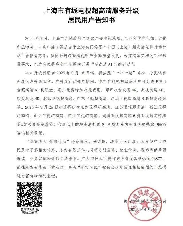 居民朋友们,赶紧行动起来,参与东方有线超高清AI升级行动,免费升级设备,解锁真4K超高清视听+智能服务的双重体验吧!如有任何疑问,可拨打客服热线96877或关注“东方有线”微信公众号咨询。