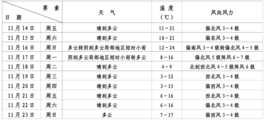 据最新气象资料分析:未来十天本区以晴好天气为主,16—18日本区受寒潮影响,将出现明显大风和降温,48小时最低气温降幅9~11℃,最低气温1~3℃(出现在19、20日),本区将出现初霜冻;16日夜里到18日白天陆地最大阵风7~8级,沿江地区8~9级。