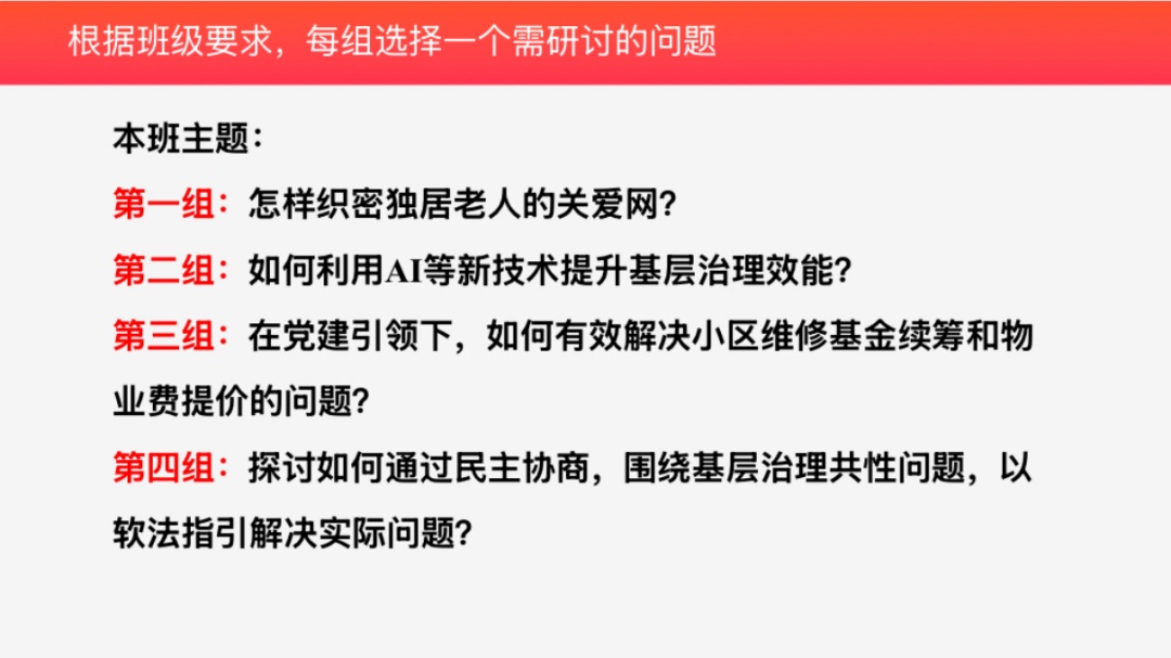 为提高培训实效,培训期间以小组为单位展开“基层治理”话题研讨,学员们在一场场“头脑风暴”中提问题、亮观点、出点子,各组分工明确齐上阵,找切口、做设计、出方案,摸透“基层痼疾”,解决痛点堵点,从织密独居老人关爱网、AI赋能基层治理、物业治理、软法治理等不同角度深入探索研究静安区基层现代化治理的新路径。