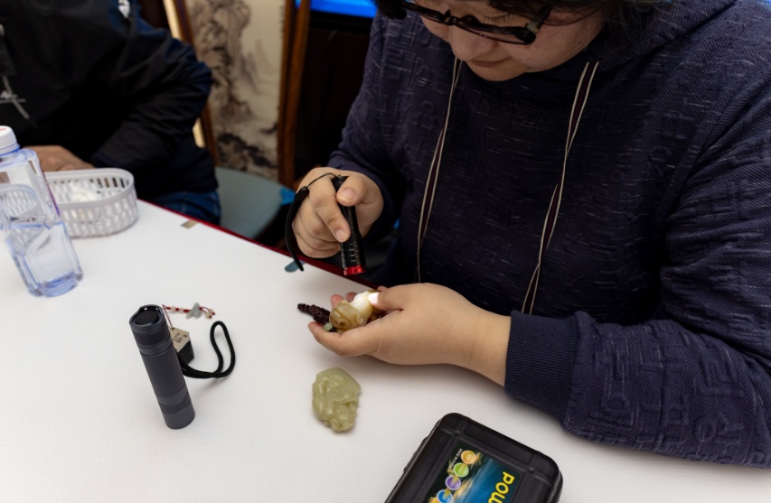 进入现场鉴定环节,两张鉴定桌前有序排起队伍。居民们纷纷拿出珍藏的珠宝饰品——有传承多年的玉石貔貅、日常佩戴的黄金项链,也有年轻人的翡翠戒指。鉴定师借助专业工具,细致检查珠宝材质、工艺及无损情况,为居民消除顾虑。
