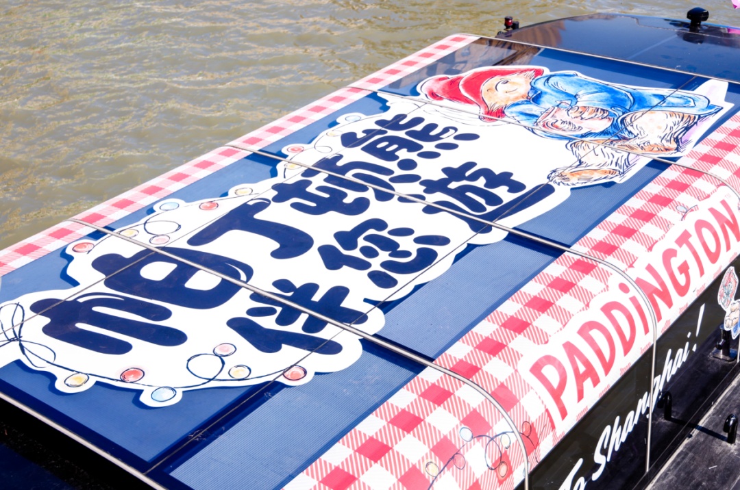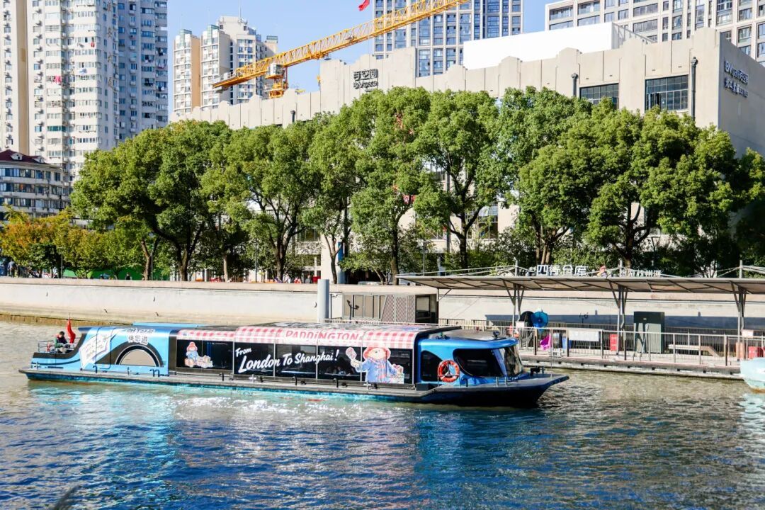 本次悠游苏州河水上航线将其璀璨星河系列游船“昌平号”打造成为“帕丁顿主题游船”,船身以巨型帕丁顿熊造型为主视觉,还原其坐在复古行李箱上、手捧礼物的经典形象,搭配“From London To Shanghai!”标语,复刻了电影中的温暖场景。