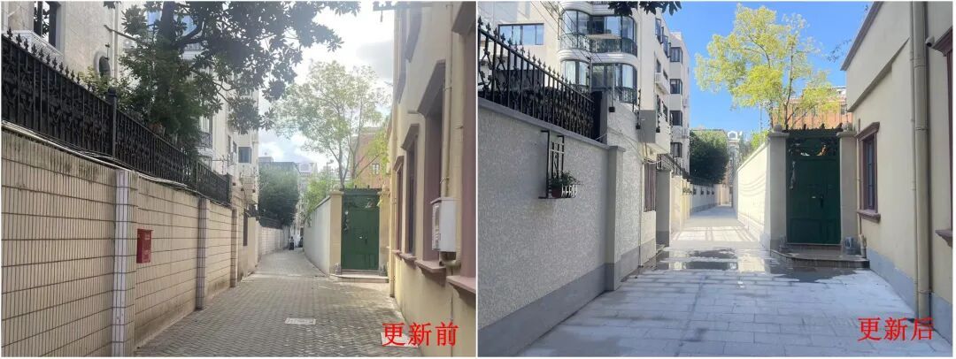 抬头望去,过去裸露在外的空调外机被统一的浅灰色机罩包裹,杂乱的晾衣绳换成了沿墙设置的金属晾衣架,几件刚洗好的衣物整齐悬挂,透着生活的烟火气;脚下的路面也“改头换面”,陈旧破损的老地砖换成了平整光洁的大理石铺装,就连角落的杂物堆放处,如今也清理得干干净净,留出了宽敞的通行空间。