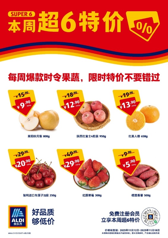 高质价比产品,又来了!近日,记者从ALDI奥乐齐获悉,其上线全新的“超6特价”活动,每周以周三至下周二为周期,精选6款当季时令蔬果推出限时特价,覆盖奥乐齐所有门店。