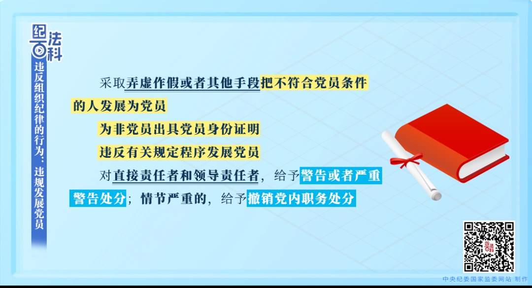 《中国共产党纪律处分条例》第八十九条规定,违反党章和其他党内法规的规定,采取弄虚作假或者其他手段把不符合党员条件的人发展为党员,或者为非党员出具党员身份证明的,对直接责任者和领导责任者,给予警告或者严重警告处分;情节严重的,给予撤销党内职务处分。违反有关规定程序发展党员的,对直接责任者和领导责任者,依照前款规定处理。