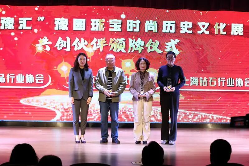 在文化活动中心同步揭幕的“珠玉汇市 触见百年匠心——‘珠豫汇’豫园珠宝时尚历史文化展”同样吸引着众人目光。展柜内,老凤祥的经典金饰、豫园珠宝的时尚设计熠熠生辉,从“珠玉汇市”的百年商脉到如今的创新设计,每一件展品都诉说着珠宝文化的传承与蜕变。开幕式上,“金展伙伴”授奖与“共创伙伴”颁牌仪式庄重举行,行业协会与企业代表接过荣誉,这不仅是对匠心的表彰,更彰显了文化与产业跨界联动、共促发展的决心。