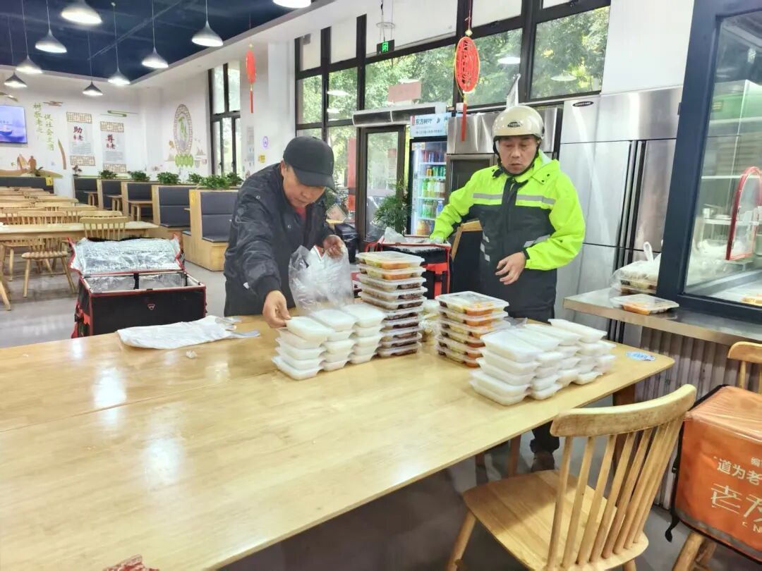 活动当天,前来取餐的骑手们小心翼翼地将装满盒饭的保温箱搬上运餐车上,开始给老人送餐。一位骑手介绍:“为了确保送到老人手中的饭菜始终热气腾腾,我们提前根据地址,按照就近原则,排布了送餐路线。既要保证每一餐都能准确无误地送到老人手中,又要确保送餐及时,让老人们能尽快吃上热乎饭。”