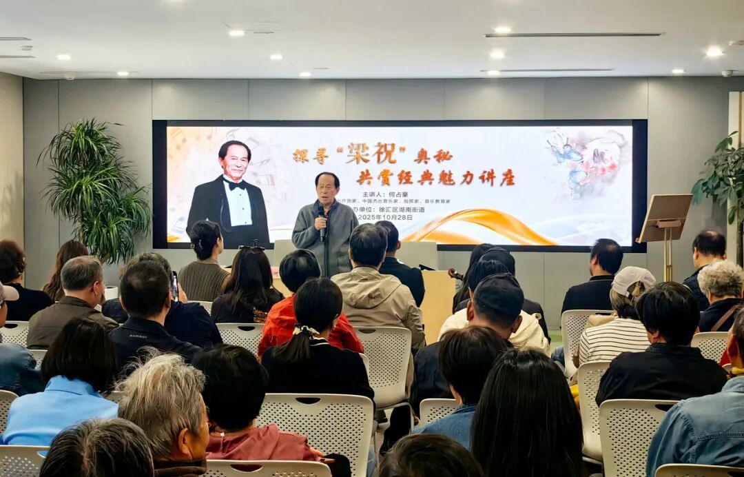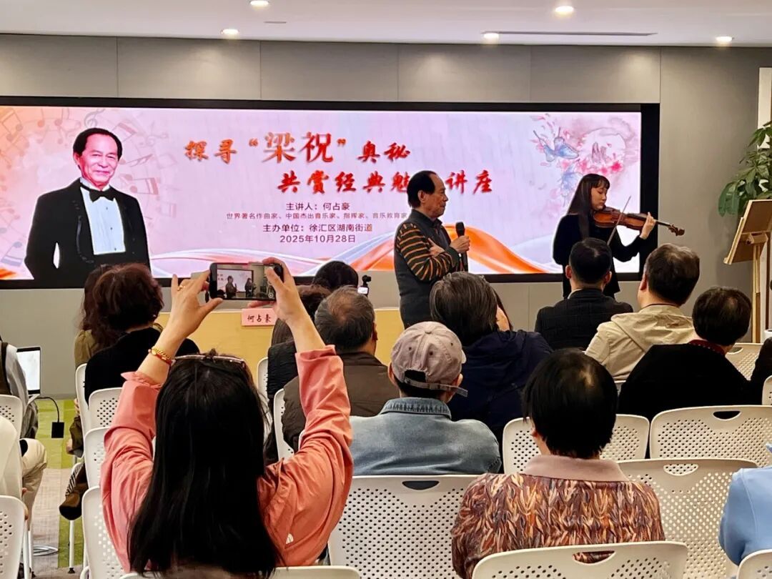 近日,在位于复兴西路8号的徐汇区湖南街道党群服务中心内,街道特邀居住在辖区的文化知名人士——《梁祝》小提琴协奏曲主创之一、著名作曲家、音乐家、指挥家何占豪,以“探寻‘梁祝’奥秘,共赏经典魅力”为主题作讲座,解锁经典旋律背后的文化密码与创作初心。