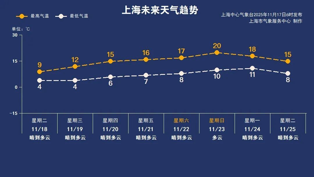 11月20日(周四):晴到多云,6~15℃