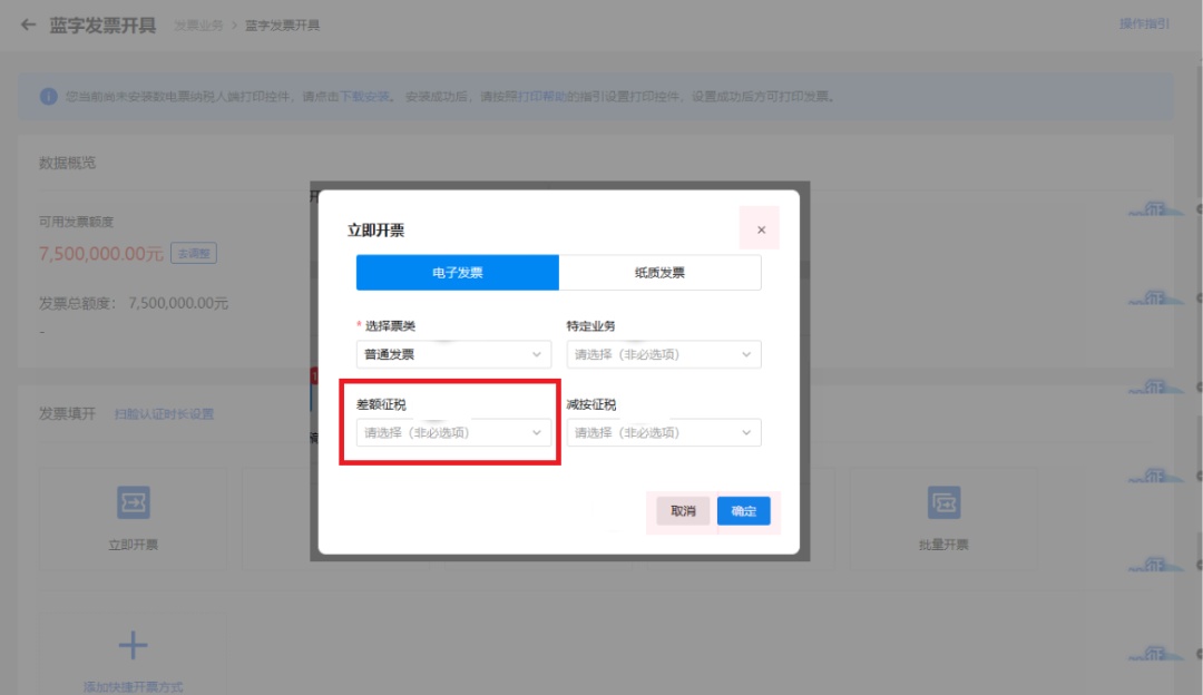 登录电子税务局,在发票开具模块依次点击“蓝字发票开具”→“立即开票”→“选择票种(普票)”→“差额征税—差额开票”;