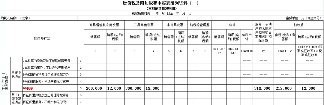 第12列“服务、不动产和无形资产扣除项目本期实际扣除金额”填入“318000”,第13列“扣除后—含税(免税)销售额”填入“212000”,第14列“扣除后—销项(应纳)税额”填入“12000”。