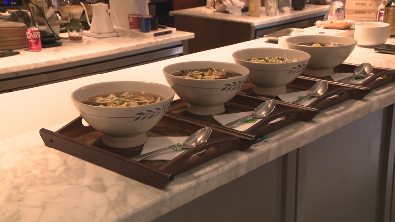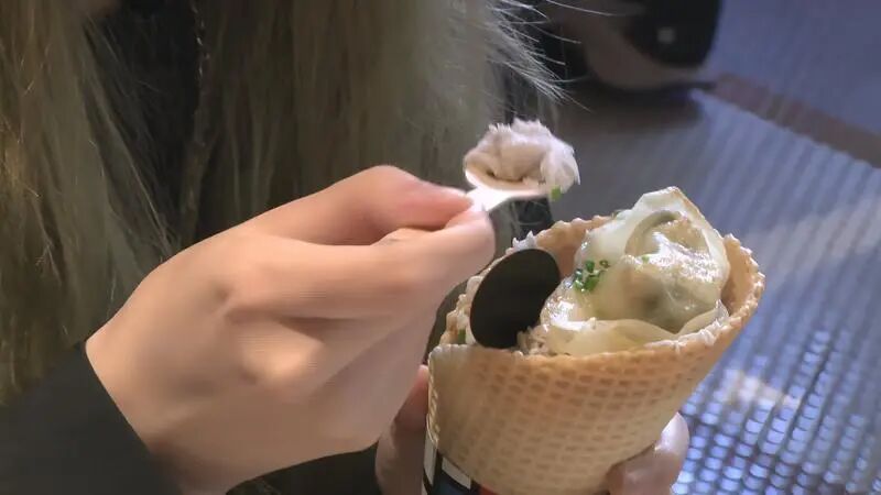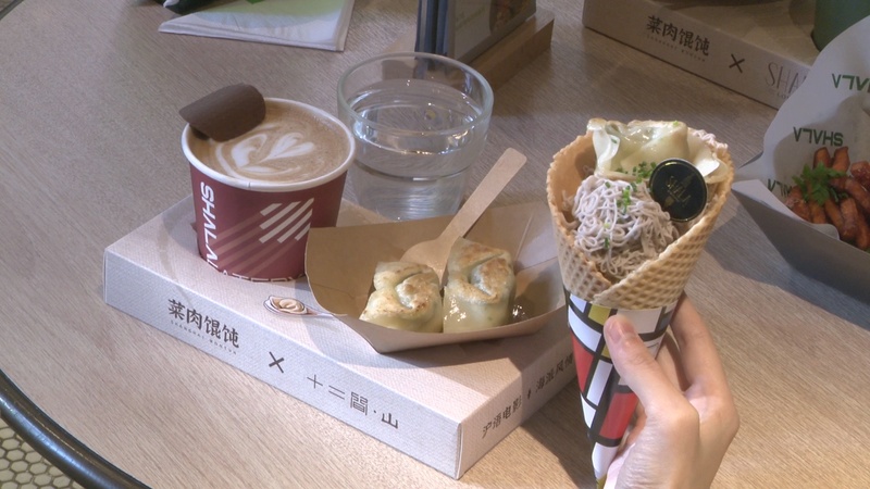 而各种创意菜肉馄饨新品更是吸引了不少观众。菜肉馄饨芋泥蛋筒、菜肉馄饨咖啡组合、红汤菜肉馄饨等创意新品引得不少观众纷纷点单。“粗看像冰淇淋,仔细看就是馄饨、意面和芋泥的混搭,蛮好吃的。馄饨比外婆包的还好吃,芋泥也蛮细腻的,冻起来也蛮好吃的。”“煎馄饨配咖啡到是蛮新颖的,在这个环境里,放点蓝调音乐,蛮有腔调的。”“看好《菜肉馄饨》的电影,再来吃碗馄饨,这个味道就更加好了。”