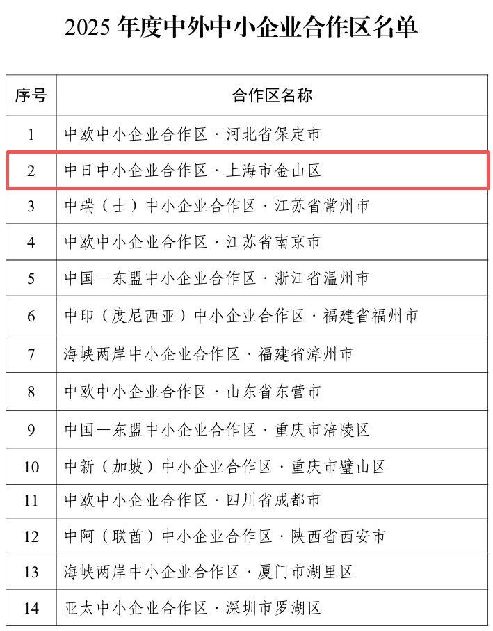 根据《中外中小企业合作区管理暂行办法》(工信部企业〔2024〕168号)、《工业和信息化部办公厅关于组织推荐2025年度中外中小企业合作区的通知》(工信厅企业函〔2025〕63号),经地市级中小企业主管部门申报、省级中小企业主管部门初审推荐、专家评审、公示等程序,确定了2025年度中外中小企业合作区(以下简称合作区)名单(见附件),现予以通告。有关要求如下: