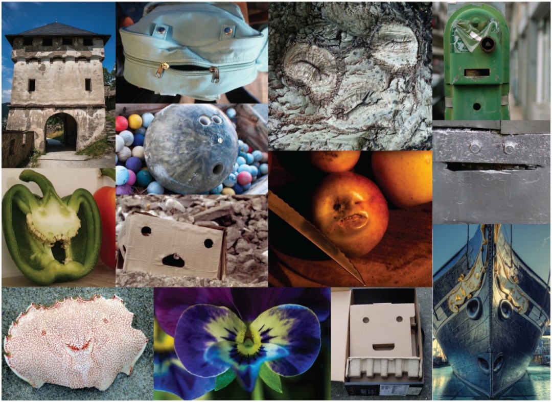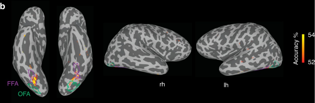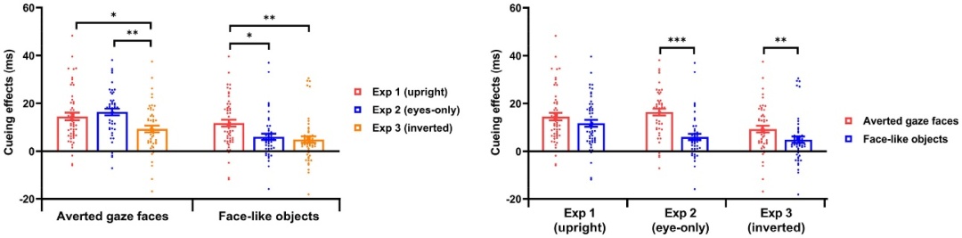 先来看一张图片: 在看到图片的第一时间,你是不是觉得有一张人脸?甚至感觉有些毛骨悚然? 这是一张拍摄于火星塞东尼亚区的一座山丘的卫星照片,常常被称为“火星人脸”,很多人曾把它当作外星智慧生命存在的有力证据。然而,后续多角度拍摄的高清照片显示,这张“人脸”只是岩石在光影作用下形成的视觉假象,与外星生命毫无关联。 无独有偶,人类在月球上也曾拍摄过类似的照片。比如这张月球南极附近区域的照片,在特定的阴影下,坑洞的轮廓仿佛人的眼睛、鼻子和嘴,让人浮想联翩: 这种将无生命的物体或随机图案识别成人脸的现象,在心理学中拥有一个专门的术语——面孔空想性错视(face pareidolia)。 想象的人脸 相信大家在日常生活中也有这样的体验:看到飘过的云朵、家中的电源插座等图形,大脑会自动想象出一张人脸。 长得像一张笑脸的插座(图片来源:Wikipedia) “有鼻子有眼”的纸盒(图片来源:liveabout) 从进化的角度看,对类似人脸物体的识别可能源自人类的社交需求。在远古时期,能够快速识别人脸构型的个体能更好地区分捕食者、识别同类,从而有更大的存活几率。因此,快速识别人脸的神经回路和相关基因在自然选择中被保留了下来,最终造就了我们今天观察到的面孔空想性错视现象。 在神经层面上,我们大脑中存在一些专门对面孔响应的脑区,如梭状回面孔区(fusiform face area, FFA)和枕叶面孔区(occipital face area, OFA)。神经科学研究表明,人类参与者在看“类面孔物体”和与之匹配的普通物体时,上述两个面孔区的活动模式有显著的差异,而物体或场景选择性脑区的活动没有差异。由此可见,大脑中的面孔选择性脑区也参与了“类面孔物体”的信息加工。 通过神经活动解码类面孔物体或匹配物体的准确率最高的脑区,与FFA和OFA部分重合(rh为右半球,lh为左半球)(图片来源:参考文献[1]) 受到社交需求驱动,面孔空想性错视还表现出一个有趣的现象——多种多样的类人脸物体不仅看起来像人脸,还能唤起我们对其作为“主体”的心理感知。比如,一栋建筑的立面可能看起来像是在盯着你,一个甜椒仿佛带着愉悦的表情。我们会拟人化地推断“人脸”背后主体的情绪和潜在意图,注意力也会被“对方”吸引,就好像在与他人进行真实的社交。 多种多样的类人脸图案 你有从它们的“脸”上看出表情和情绪吗? (图片来源:参考文献[2]) 脸在看向哪里? 关于人脸,还有一个值得注意的现象。为了获取社会信息,我们通常会朝着他人目光转移的方向看去,注意力也向他人目光转移的方向引导。心理学对此有一个专门描述的术语——目光转移面孔(averted gazes),指的是一张把目光移向一边的脸(或者像脸的物体)。 目光转移的面孔(图片来源:参考文献[4]) 目光转移引导注意力的机制可能有许多种。首先,目光移向一侧造成了图形本身的不对称,即使我们不将图形解读为具有社会属性的“面孔”,像不对称这种低级物理属性也可能引导我们的注意力。其次,从社会属性层面来看,全局的整体面部构型和局部的目光特征(比如眼部朝向)也可能成为影响注意力的因素。 回到前面提到的面孔空想性错视,心理学家提出了一个新奇的问题:类人脸物体是否也能引导注意方向?如果能,它们是通过什么机制引导注意的?最近,来自中国科学院心理研究所的研究团队通过精心设计的行为实验,探究了目光转移面孔和类人脸物体的注意引导效果,并揭示了背后可能的机制,从而系统性回答了上述问题。 精巧的实验设计 研究者使用注视线索任务(gaze cueing task)回答了上面的问题。在这一任务中,计算机屏幕上快速呈现一种提示刺激,可能提示接下来的目标刺激在左边或右边。紧接着,屏幕左侧或右侧呈现目标刺激,被试需要按键报告目标刺激呈现在左侧还是右侧。尽管被试被告知提示刺激和目标刺激的位置是无关的,但如果提示刺激引导了注意,即提示刺激的位置与目标刺激一致,被试反应时间会更快(示意图见下图)。 注视线索任务的流程图(图片来源:参考文献[4]) 研究者精心设计了使用的提示刺激。 实验一 使用了三种提示刺激:目光转移的面孔、直视观察者的面孔以及向右或向左看的面孔状物体(下图左侧)。 实验二 使用了实验一中刺激仅包含眼部的版本(下图中间)。这种刺激去除了整体面孔构型这个因素,保留了眼部特征和部分低级物理属性。 实验三 使用了实验一中刺激的倒置版本(下图右侧),这种刺激同样排除了整体面孔构型因素,而保留了局部特征和低级物理属性。 实验四 在同一群被试上进一步验证了不同因素对注意导向的影响。 实验使用的提示刺激(图片来源:参考文献[4]) 通过比较提示刺激与目标刺激位置一致与不一致条件下被试反应时间的差异,可以定量描述该种提示刺激引导注意的效果(也称为线索效应)。通过比较不同提示刺激引导注意的效果,研究者可以探究面孔空想性错视引导注意的机制。 研究发现了以下几个有趣的现象。 首先,实验一中,目光转移的面孔和“类面孔物体”都能显著引导注意(下图中,实验一的线索效应均显著大于0)。具体而言,在两种刺激条件下,提示刺激方向与目标刺激位置一致时,被试反应时间更快,这说明面孔空想性错视确实能引导注意。 其次,局部特征对注意力引导有重要作用。实验二中,仅包含眼部的刺激也能引导注意;且跨实验比较
