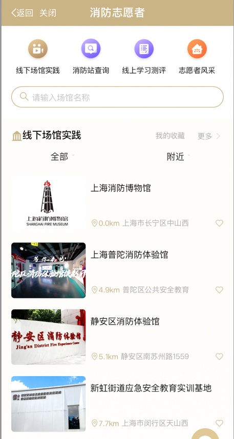 通过地图定位查找身边场馆、消防站进行预约,并可随时在线报名参与各消防单位发起专项志愿者活动,加入志愿行列。