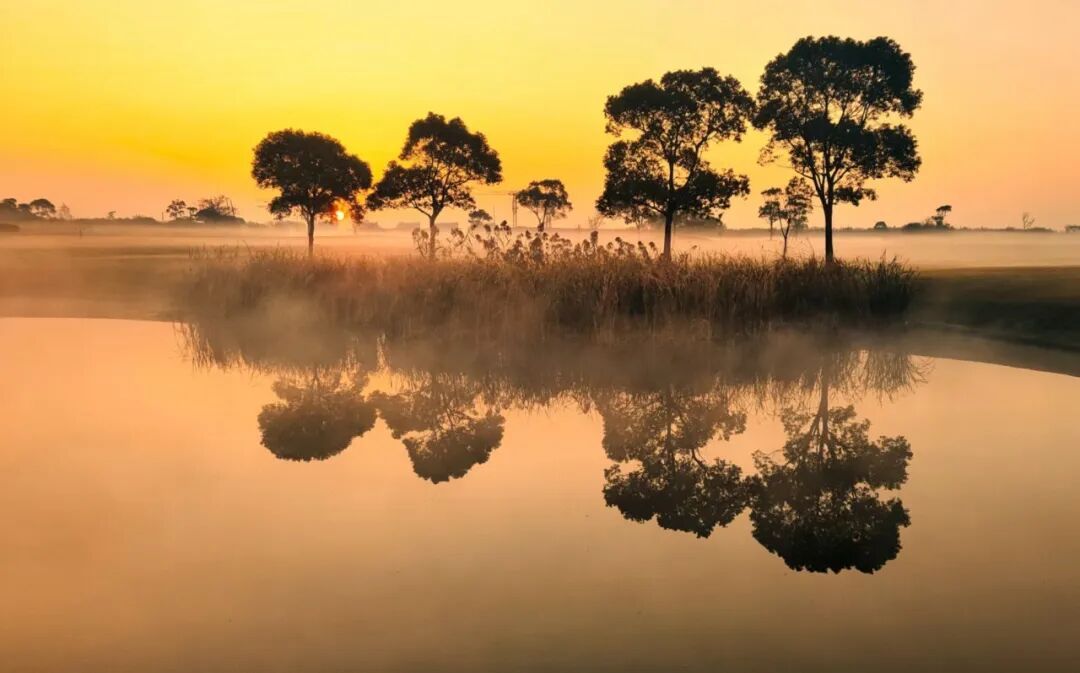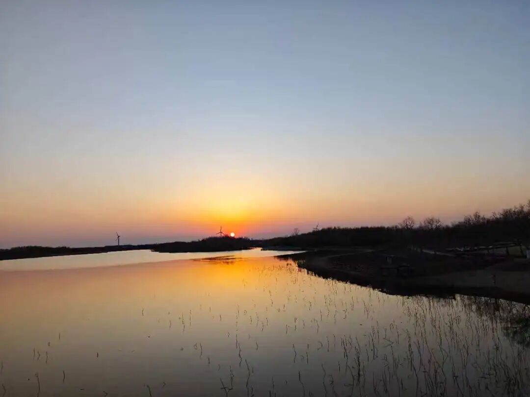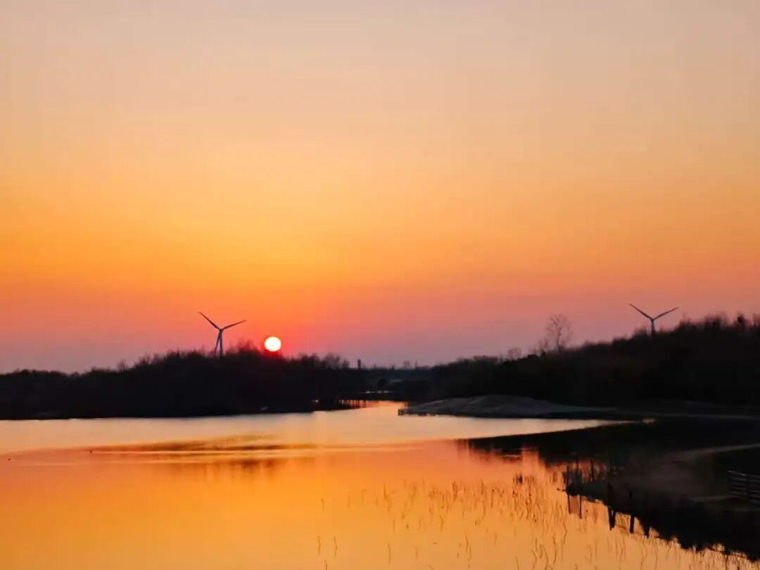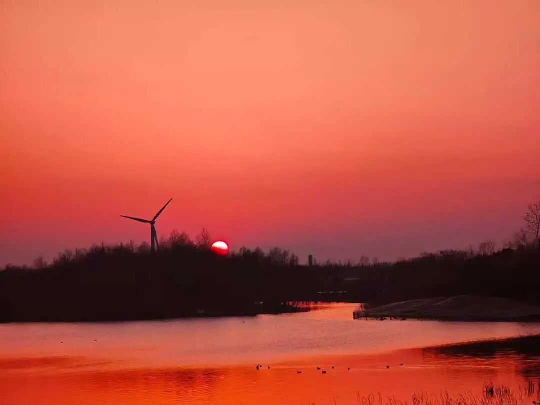 傍晚的河岸是秋日的重头戏:夕阳把天空烧作橘红与玫粉的渐层,风力发电机的剪影浸在碎金般的水波里,偶有几羽水鸟划破倒影,连风都慢了下来。
