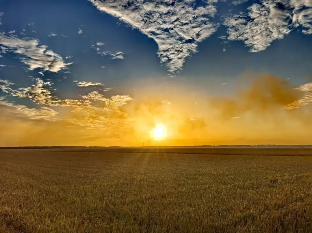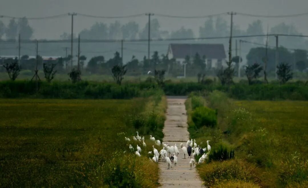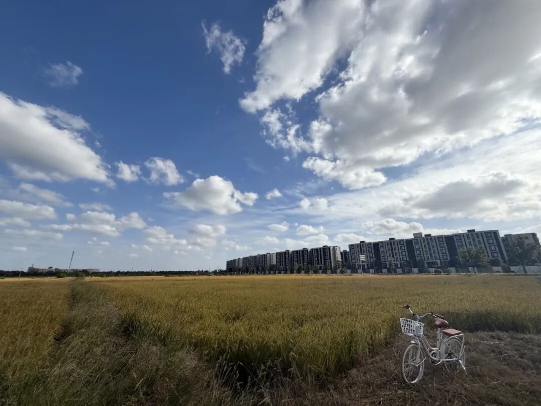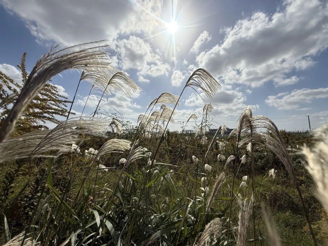 稻田在风里掀起金浪,白芒草的花序随着晚风轻晃,阳光穿过云隙落在草尖上,连空气都裹着谷物的暖香。