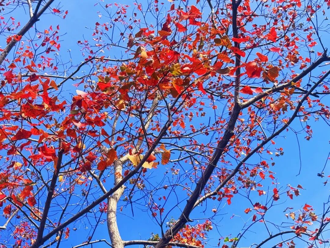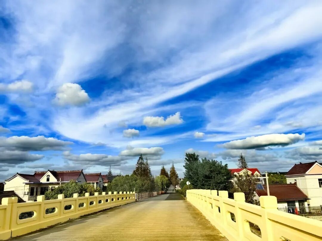 三角枫的叶尖染透了绯色,衬着澄澈的蓝天像打翻的颜料盘;穿村而过的桥栏被秋阳晒得暖黄,白墙红瓦的民居藏在树影里,连云都飘得比别处更慢。