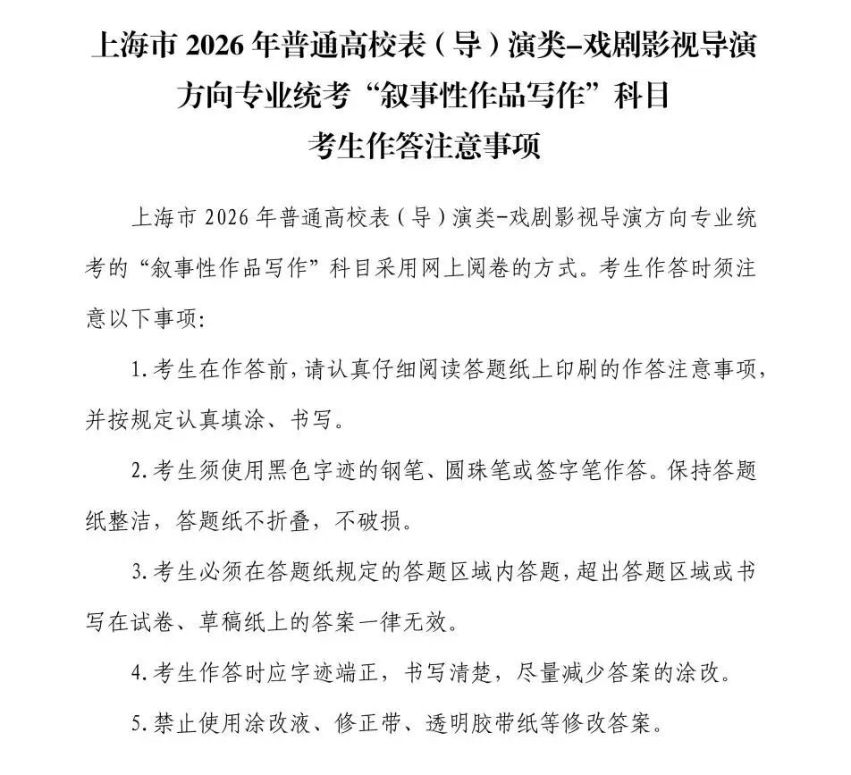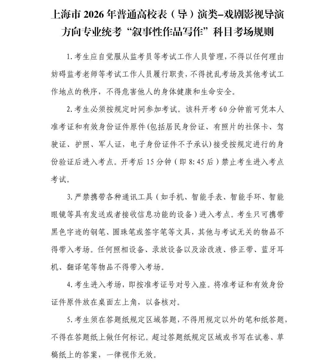 市教育考试院介绍,上海市2026年表(导)演类-戏剧影视表演方向、表(导)演类-戏剧影视导演方向专业统考将于2025年11月22日至23日进行。为确保考生能够顺利参加考试,这份考前提示请查收↓