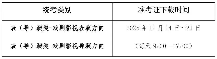 符合上海市高考报名资格、已在网上报名确认参加表(导)演类-戏剧影视表演方向、表(导)演类-戏剧影视导演方向专业统考并完成网上缴费的考生,须在考前规定时间内登录“上海招考热线”网站(www.shmeea.edu.cn),点击页面下方的“考试报名”栏目进入,下载并打印本人艺术类专业统考准考证。下载时间安排如下: