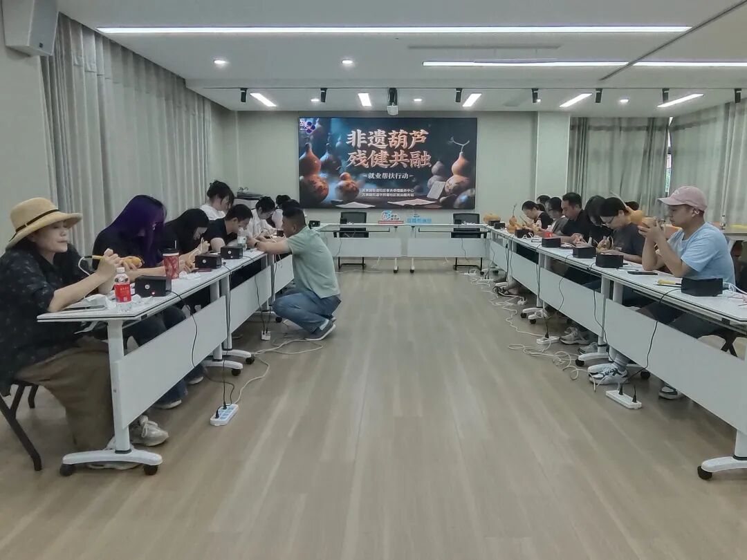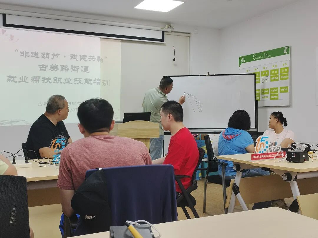结合街镇经济发展实际和群众需求,越来越多各具特色的“技能加油站”在闵行出现。作为闵行首个将非遗项目教学和残障人士就业纳入“技能加油站”的街镇,古美路街道在社区事务受理服务中心开设非遗葫芦培训班。