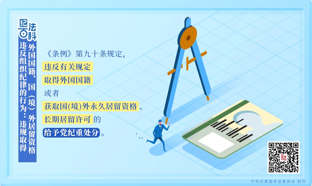 《条例》第九十条规定,违反有关规定取得外国国籍或者获取国(境)外永久居留资格、长期居留许可的给予党纪重处分。