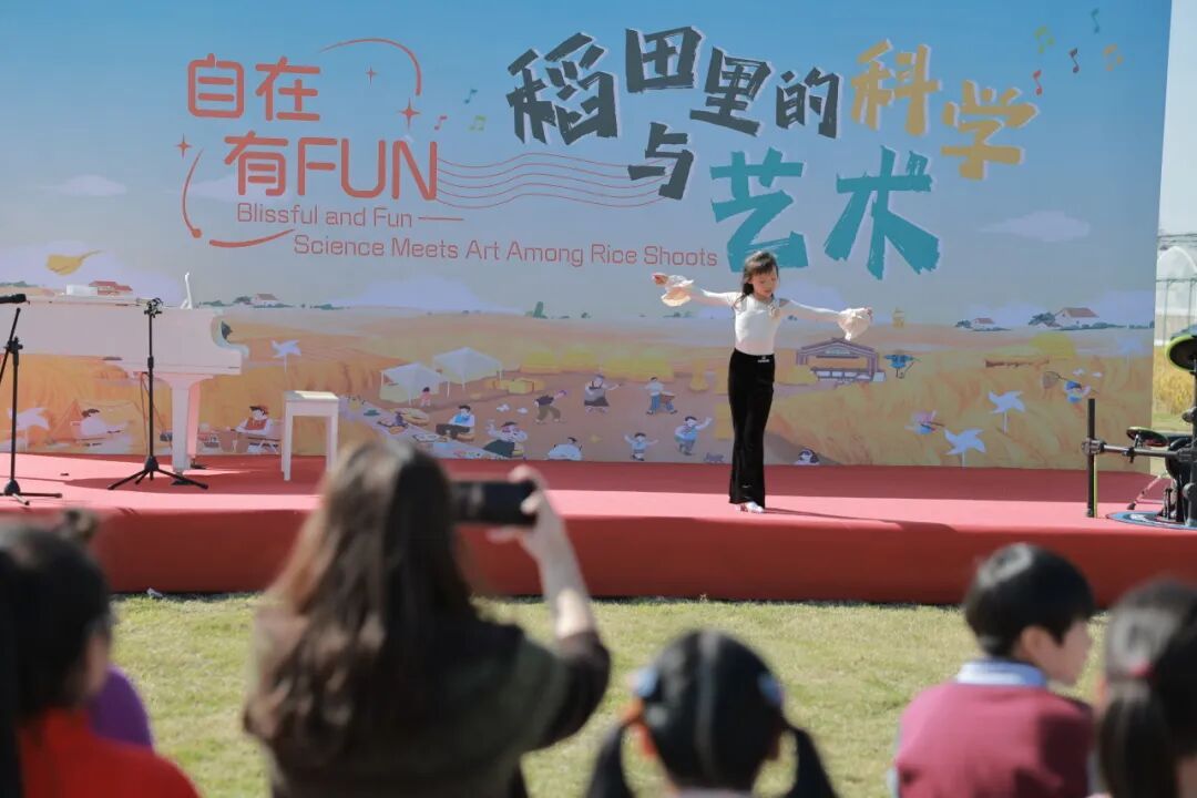 艺术也不再局限于画室。一场以天地为舞台的“稻田音乐会”,让悠扬的旋律与稻浪风声合奏。小提琴的婉转、动听的童声、优美的舞姿、竹笛的清脆,与虫鸣稻香交织,孩子们用音乐吟唱丰收的喜悦。田间美术区里,孩子们化身“自然设计师”,以湿润的泥土为底色,在田埂边拾撷稻叶、野花,在轮胎上拼贴出秋日的光影。